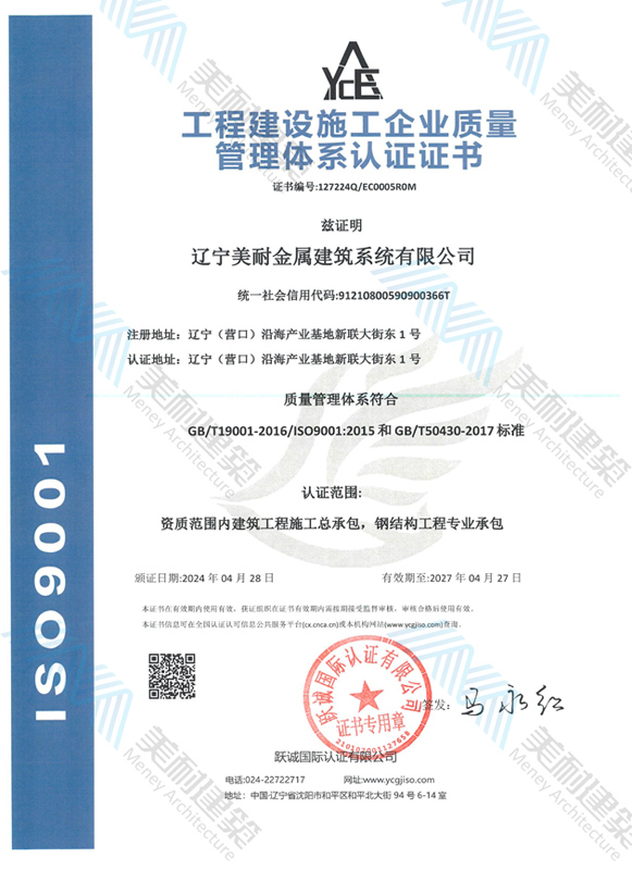 遼寧美耐金屬建筑系統(tǒng)有限公司位于遼寧(營(yíng)口)沿海產(chǎn)業(yè)基地,專(zhuān)注于預(yù)制金屬建筑系統(tǒng)領(lǐng)域,是一家集工業(yè)建筑設(shè)計(jì)、制作、施工及相關(guān)的技術(shù)咨詢(xún)與服務(wù)為一體的綜合性服務(wù)企業(yè)。作為國(guó)家鋼結(jié)構(gòu)協(xié)會(huì)會(huì)員、中國(guó)建筑金屬結(jié)構(gòu)協(xié)會(huì)會(huì)員單位與國(guó)家高新技術(shù)企業(yè),美耐建筑集建筑工程施工總承包、鋼結(jié)構(gòu)工程專(zhuān)業(yè)承包等多種資質(zhì)于一身,并擁有22項(xiàng)鋼結(jié)構(gòu)建筑領(lǐng)域?qū)@?項(xiàng)軟件著作權(quán)。